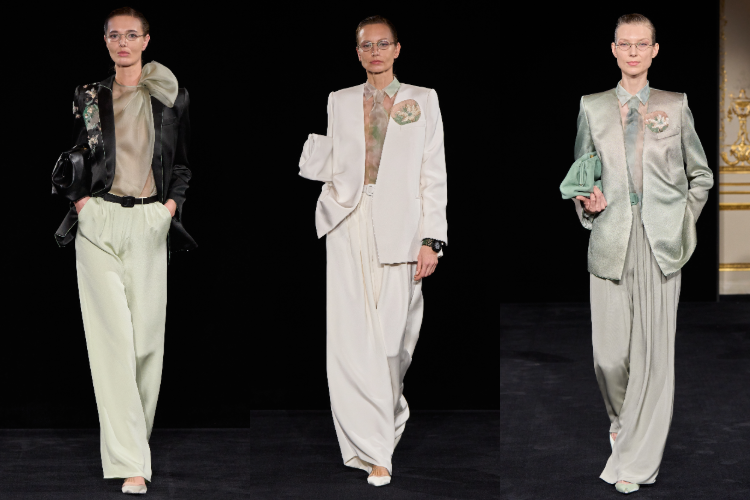 Un vero colpo di scena quindi per l’Alta Moda che contempla quasi esclusivamente abiti da cocktail, da sera e gran sera e da sposa. L’ultima uscita di questa sfilata parigina è stata, infatti, un abito da sposa, l’ultimo ancora disegnato da Giorgio Armani. Ad aprire la passerella, invece, ben sei uscite con gli occhiali da vista (nelle foto). Dai più piccoli quasi invisibili, metallici e dorati a quelli in acetato tondi e piuttosto ampi. Perfetti per i tailleur con pantaloni morbidi e fluidi, abbinati a giacche di vario tipo: lunghe senza bottoni, con spalle enfatizzate e ricami caratterizzanti, revers a contrasto o anche piccoli spencer. Completi indossati con bluse e camicie in chiffon trasparente con cravatte in tinta, sempre in chiffon. Un vestire con tutto il rigore del taglio maschile, ma con una revisione quanto mai femminile. Tipica della maison.