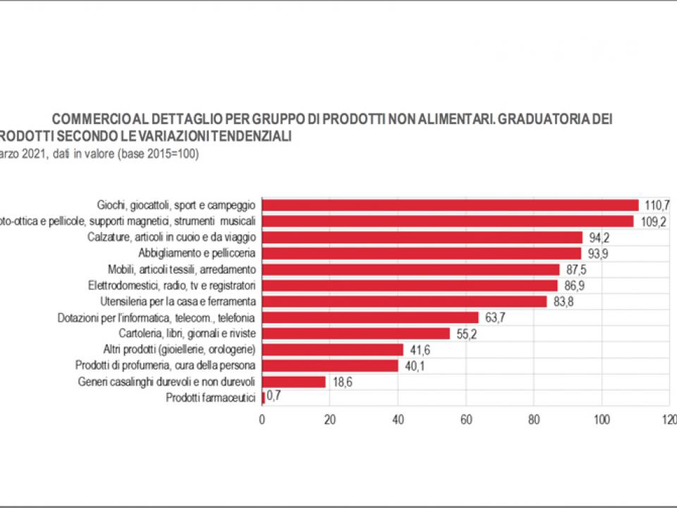 È la crescita tendenziale registrata dall’Istat, insieme a oscillazioni positive per tutti i settori. Inoltre, secondo gli ultimi dati diffusi, si stima una variazione congiunturale pressoché nulla per le vendite al dettaglio (-0,1% in valore e +0,1% in volume), che sintetizza una crescita per i beni alimentari (+1,9% in valore e +1,7% in volume) e un calo per i non alimentari (-1,6% in valore e -1,1% in volume)