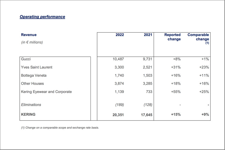 In forte incremento anche il risultato operativo corrente, con 203 milioni di euro, due volte e mezza quello dell’esercizio precedente. Il comunicato ricorda, inoltre, che «dedotti i costi aziendali, il risultato operativo corrente del segmento Kering Eyewear and Corporate nel 2022 è stato negativo per 88 milioni di euro, un tangibile miglioramento rispetto al 2021 (nella tabella sotto)».