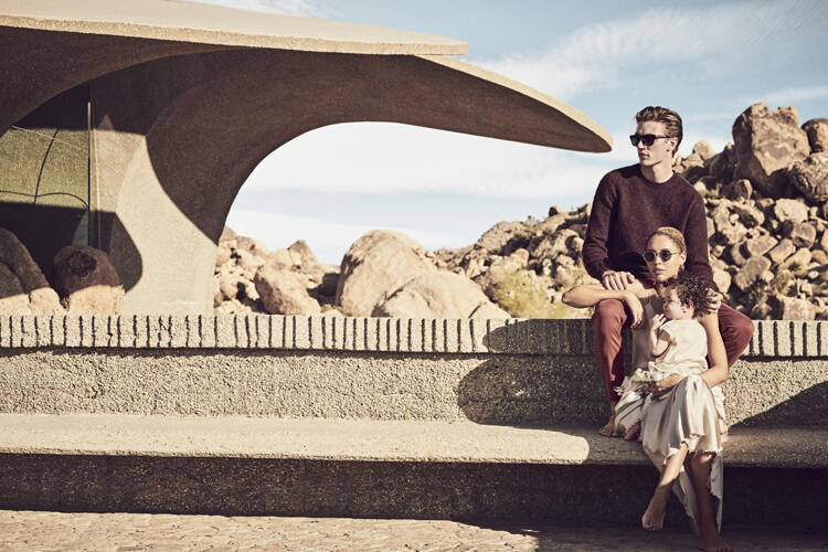 Sullo sfondo del Joshua Tree National Park, in California, il modello e musicista degli Atomics, Lucky Blue Smith, ha posato con la moglie Nara Aziza Pellman e la loro piccola Rumble Honey negli spazi dell’iconica Doolittle House, residenza privata nel cuore del parco, per le immagini della comunicazione primavera 2022 dell’housebrand di Luxottica